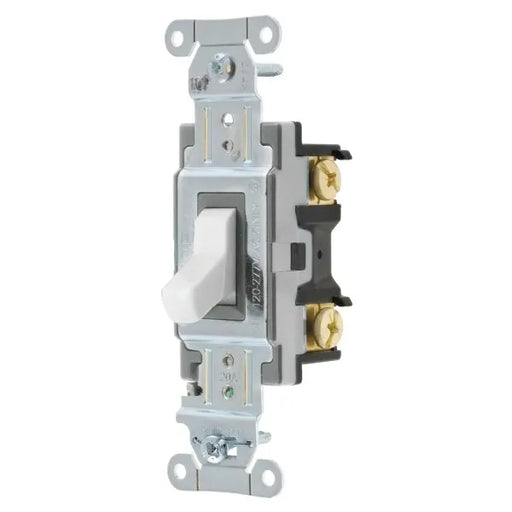 View full detailsHubbell® Pro™ Toggle Switch Ivory Nylon 3-way 120/277v 20a Back and side wired, ground screw Pkg of 1 Commercial grade Use with copper wire only M...